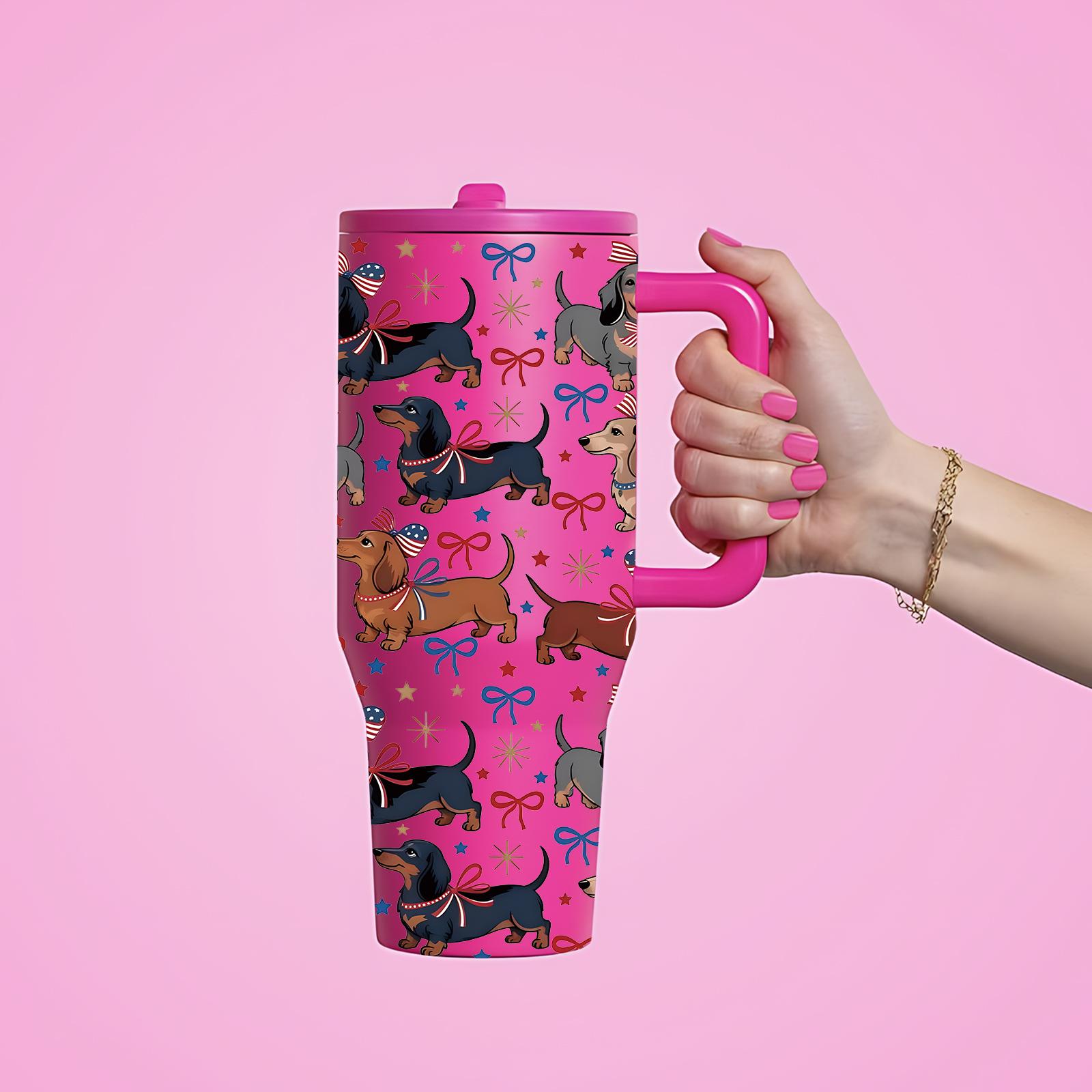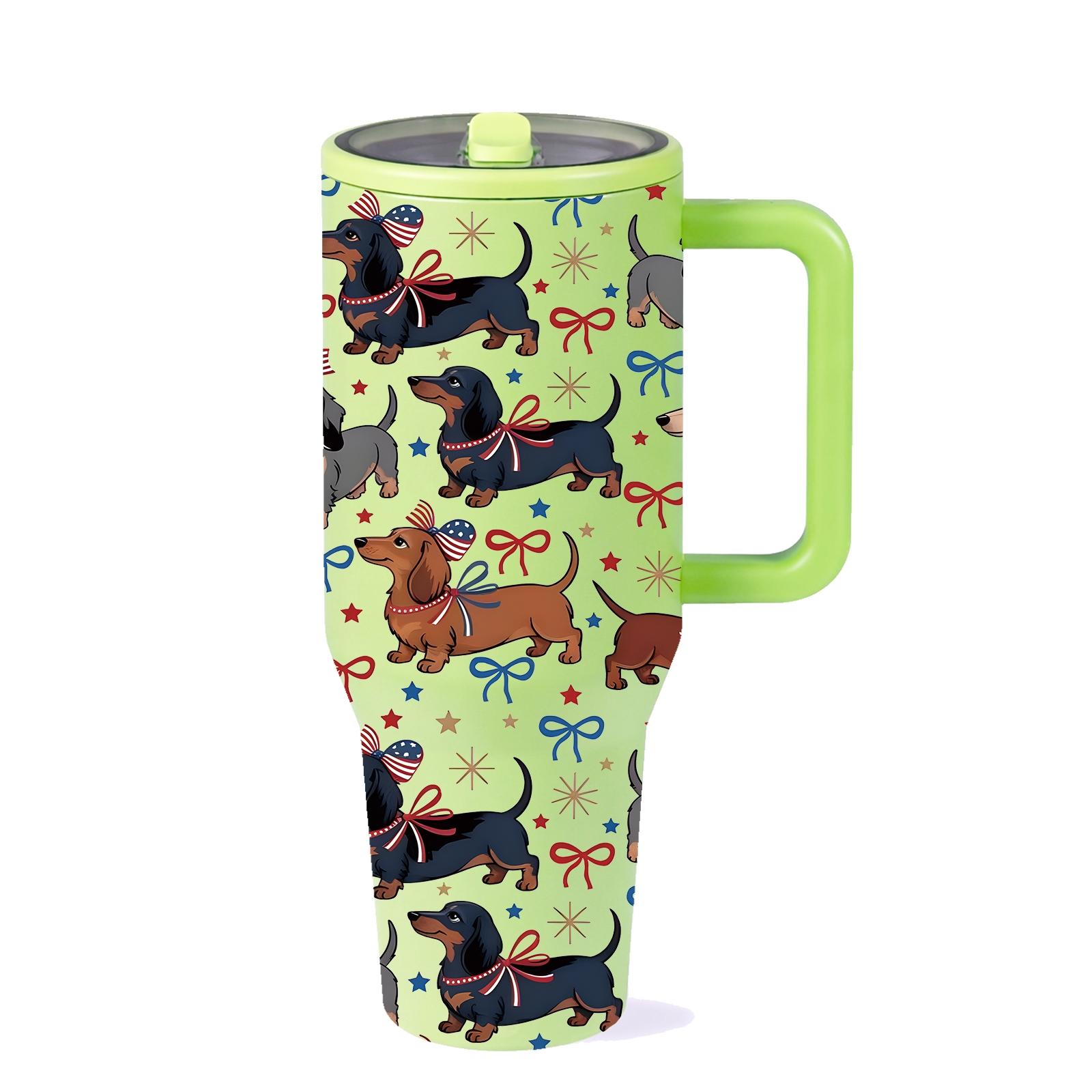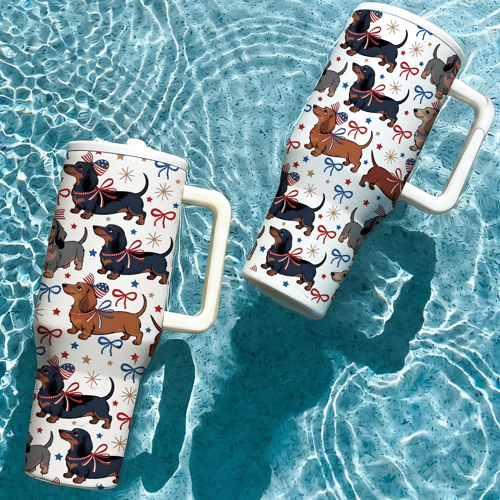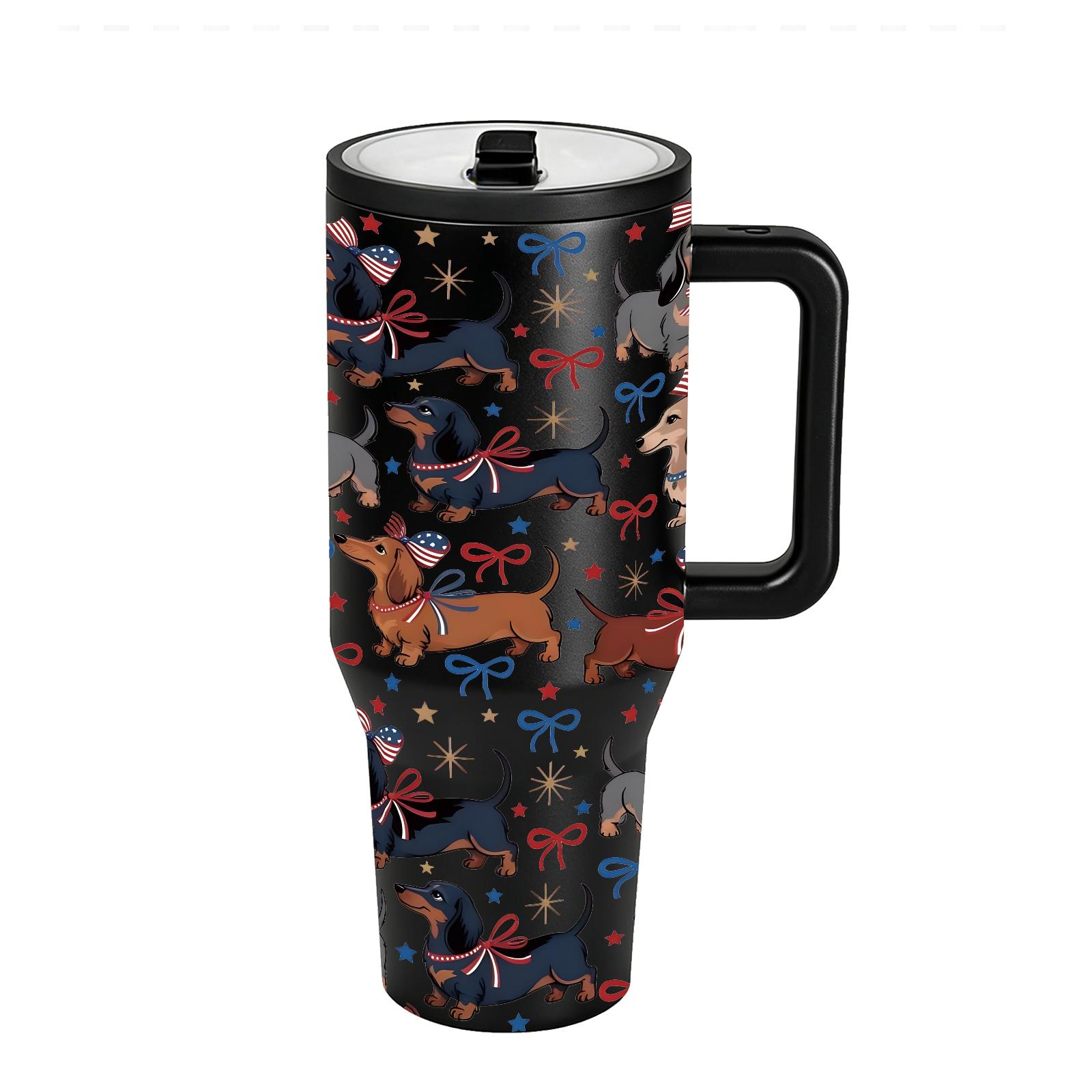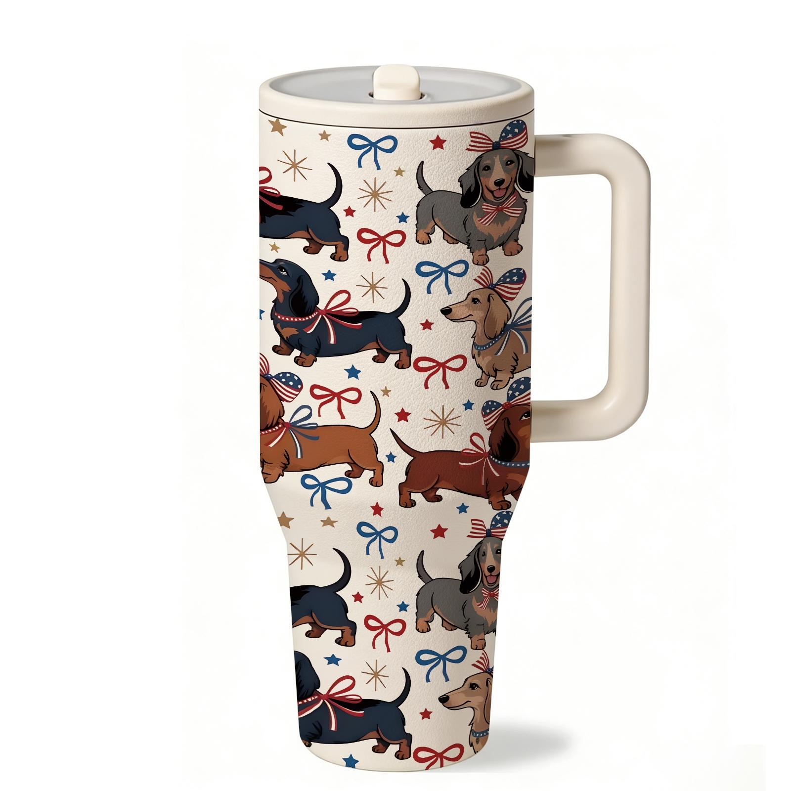 1Pc 40Oz Cute Dachshund Tumbler, Patriotic Dog Print Insulated Travel Mug with Handle, Stainless Steel Vacuum Cup for Coffee, Water and Iced Drinks, USA Style Summer Drinkware Gift for Women, Men, Dog Moms and Dog Lovers